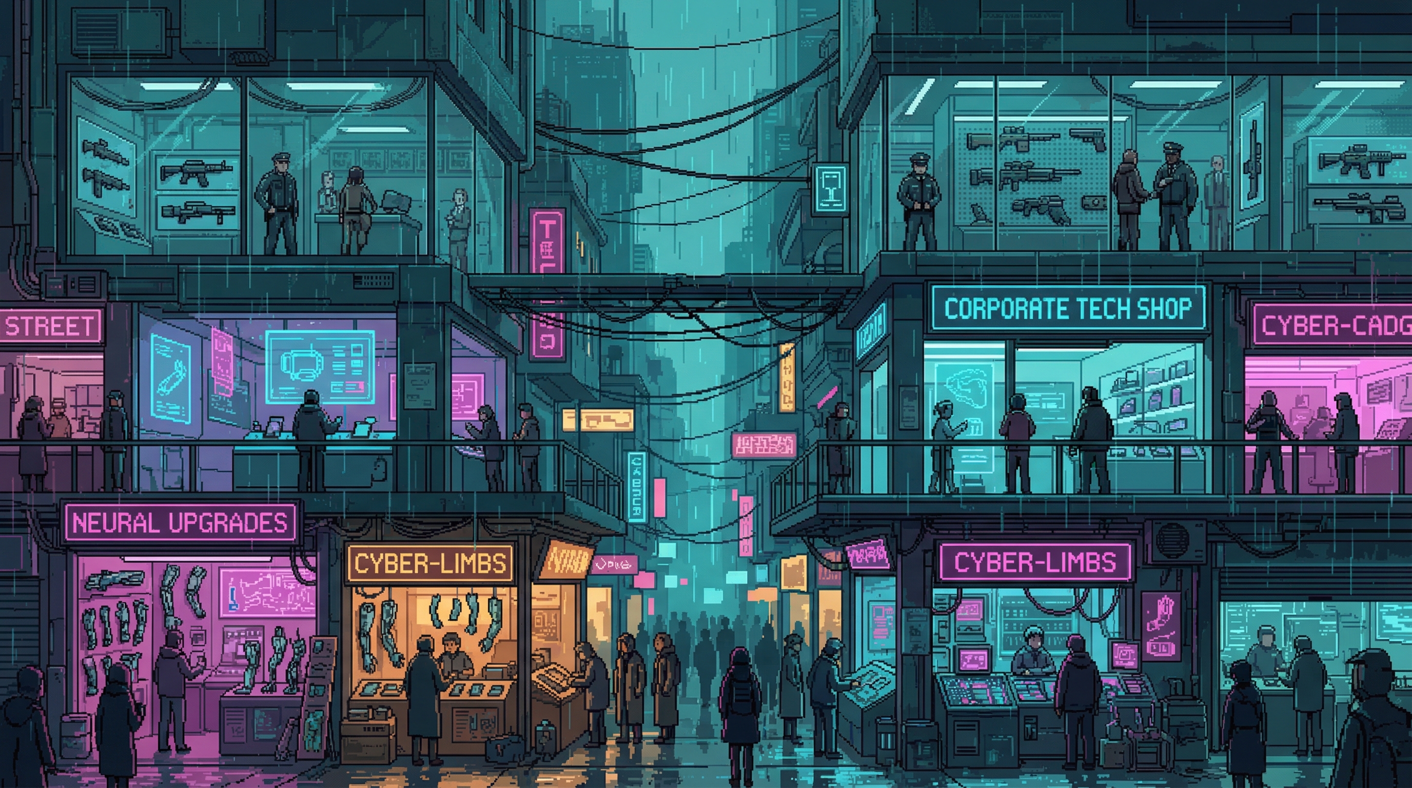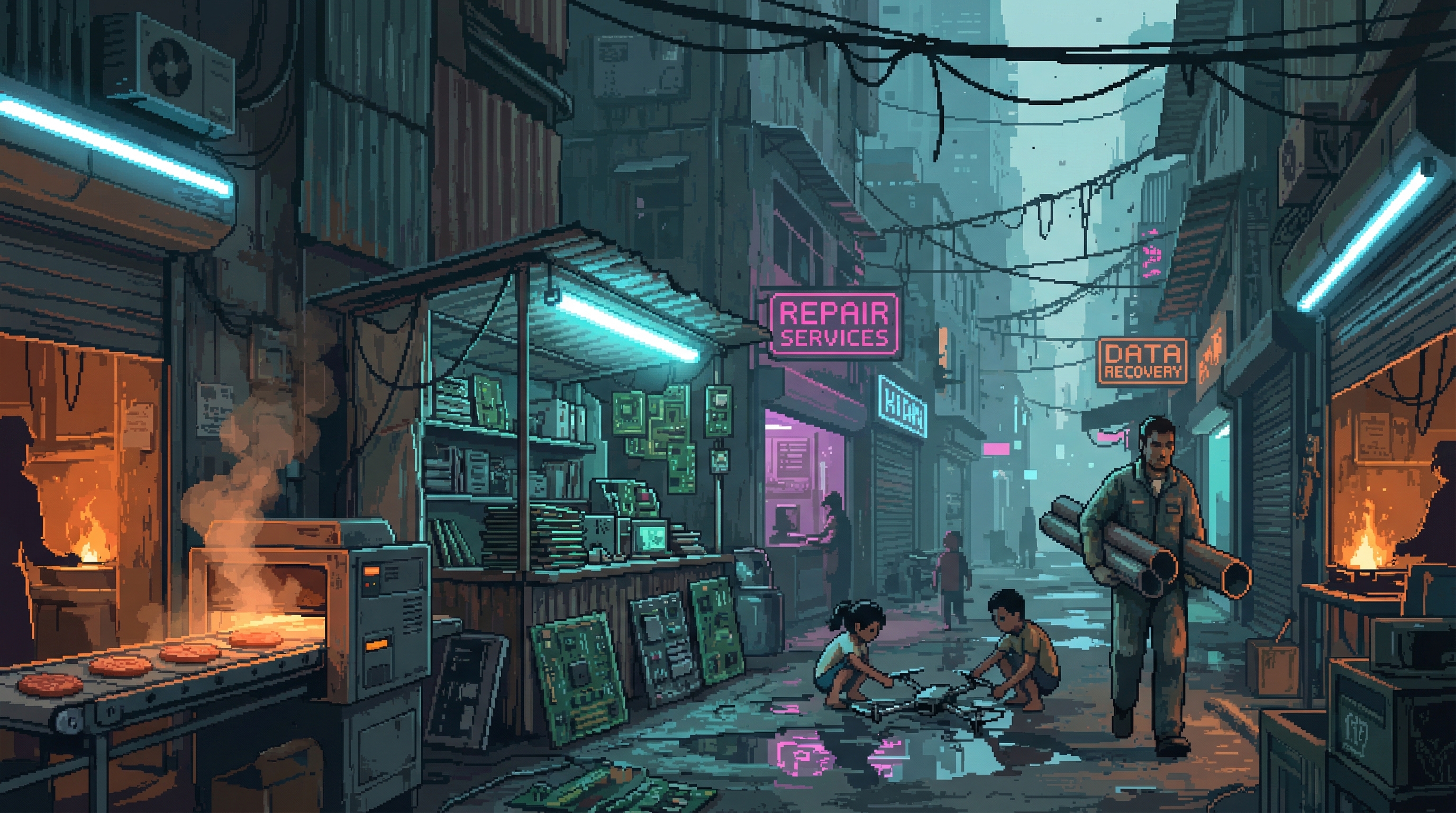 A street-level texture page following a single day in Sector 7G from multiple perspectives â a water runner, a market vendor, a kid building drones from scrap, and the governor who keeps it all from collapsing. No heroes, no rebellions, just survival with dignity in the cracks between corporate towers.