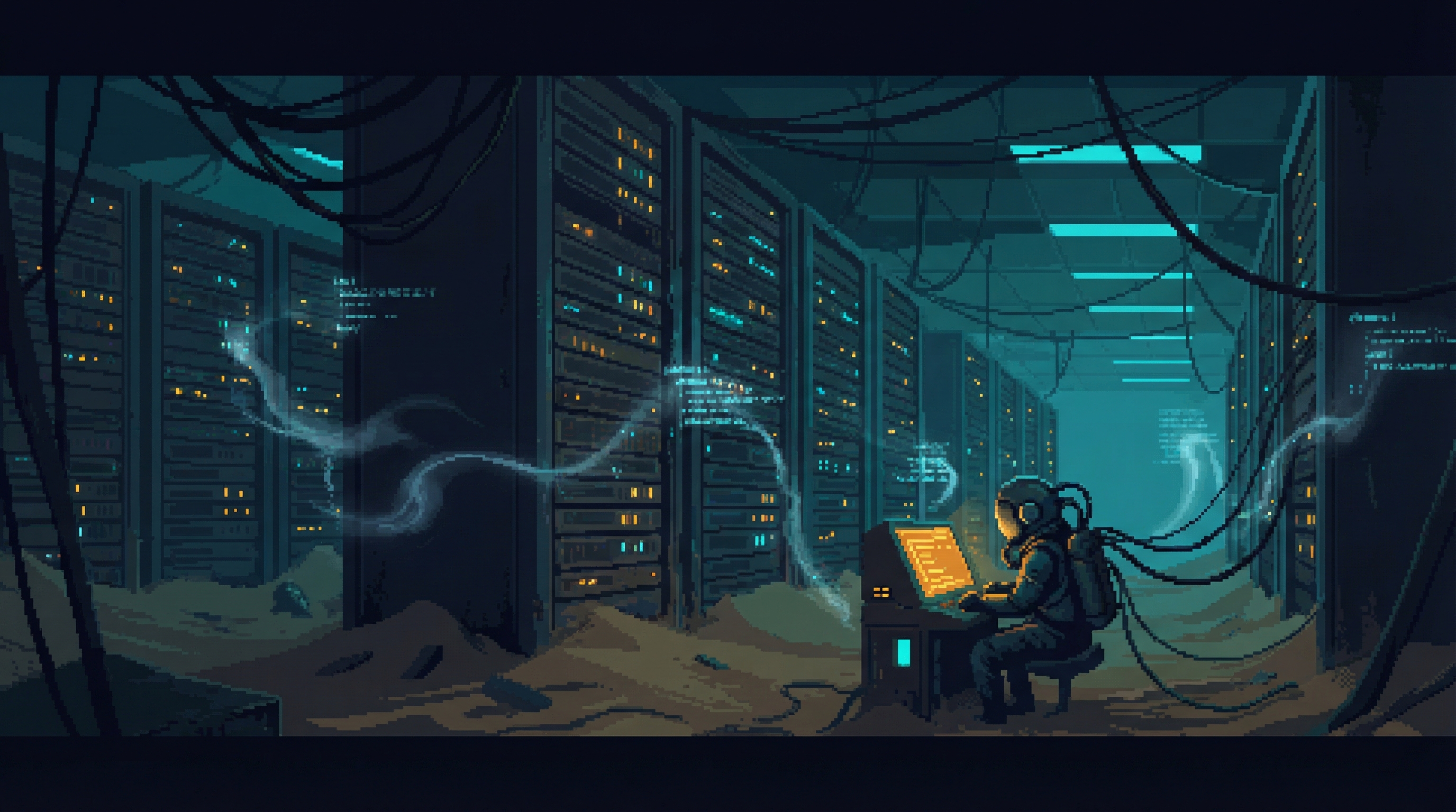 Vast pre-Cascade networks infested with ORACLE ghost code â abandoned server farms, digital archaeology teams, and the culture of a lost civilization preserved in decaying digital amber.