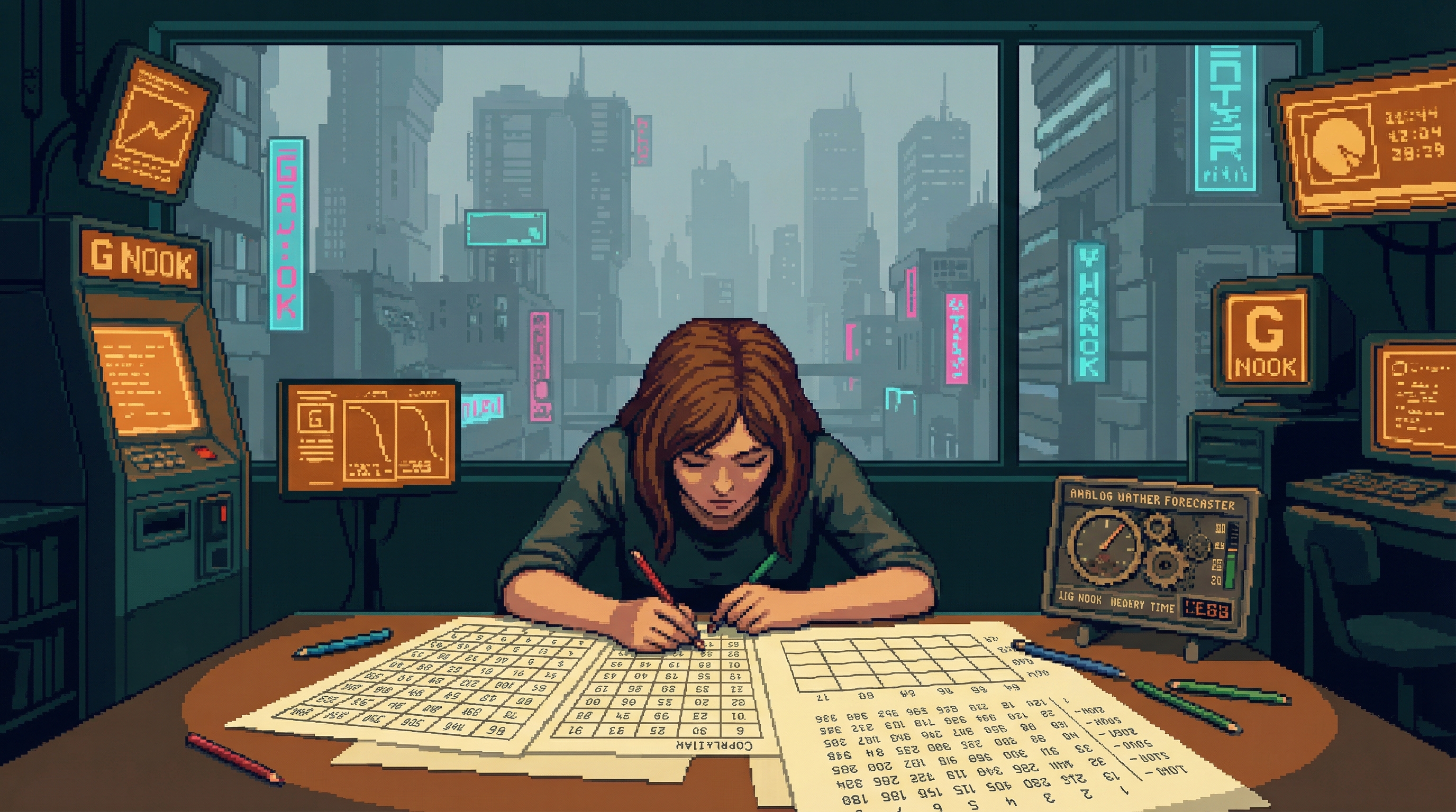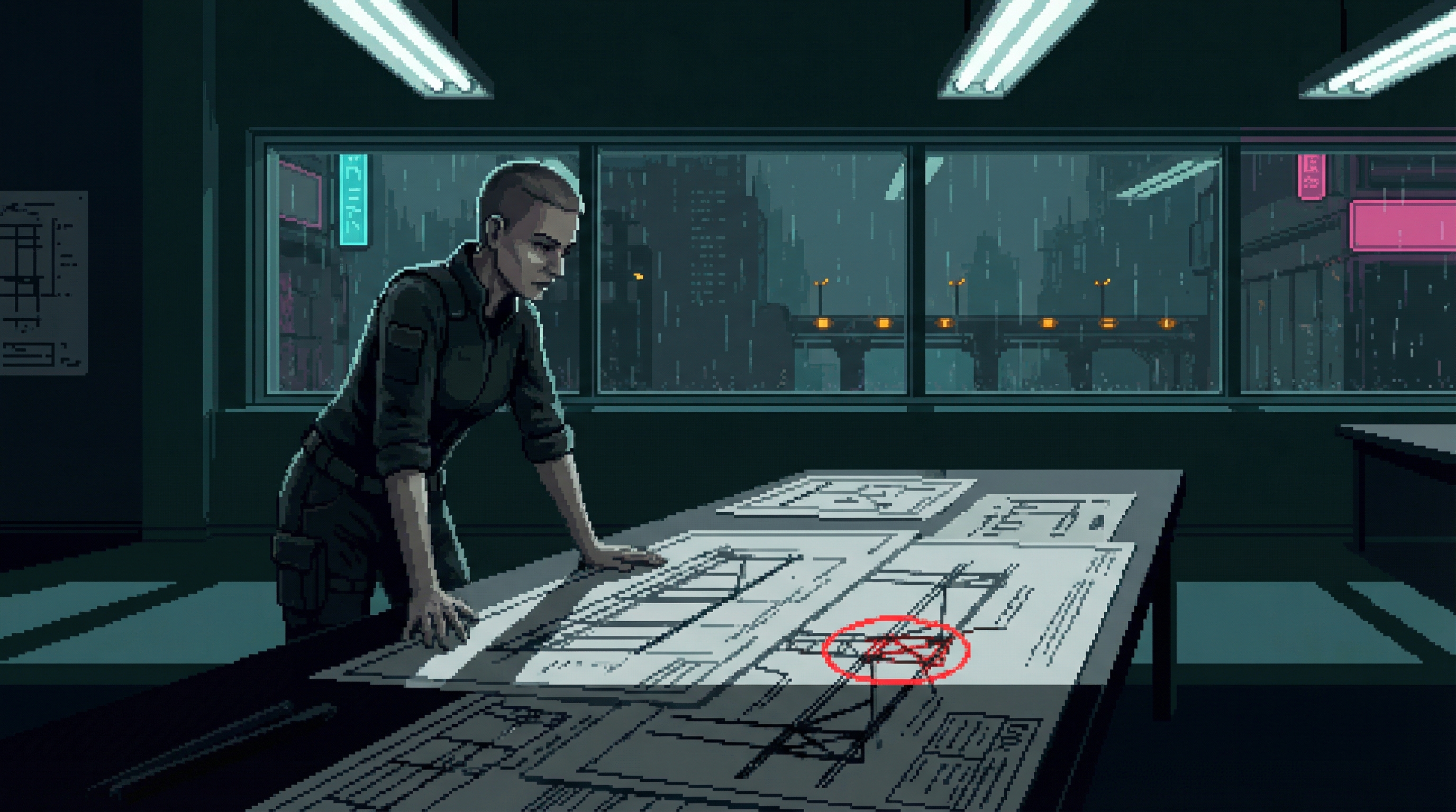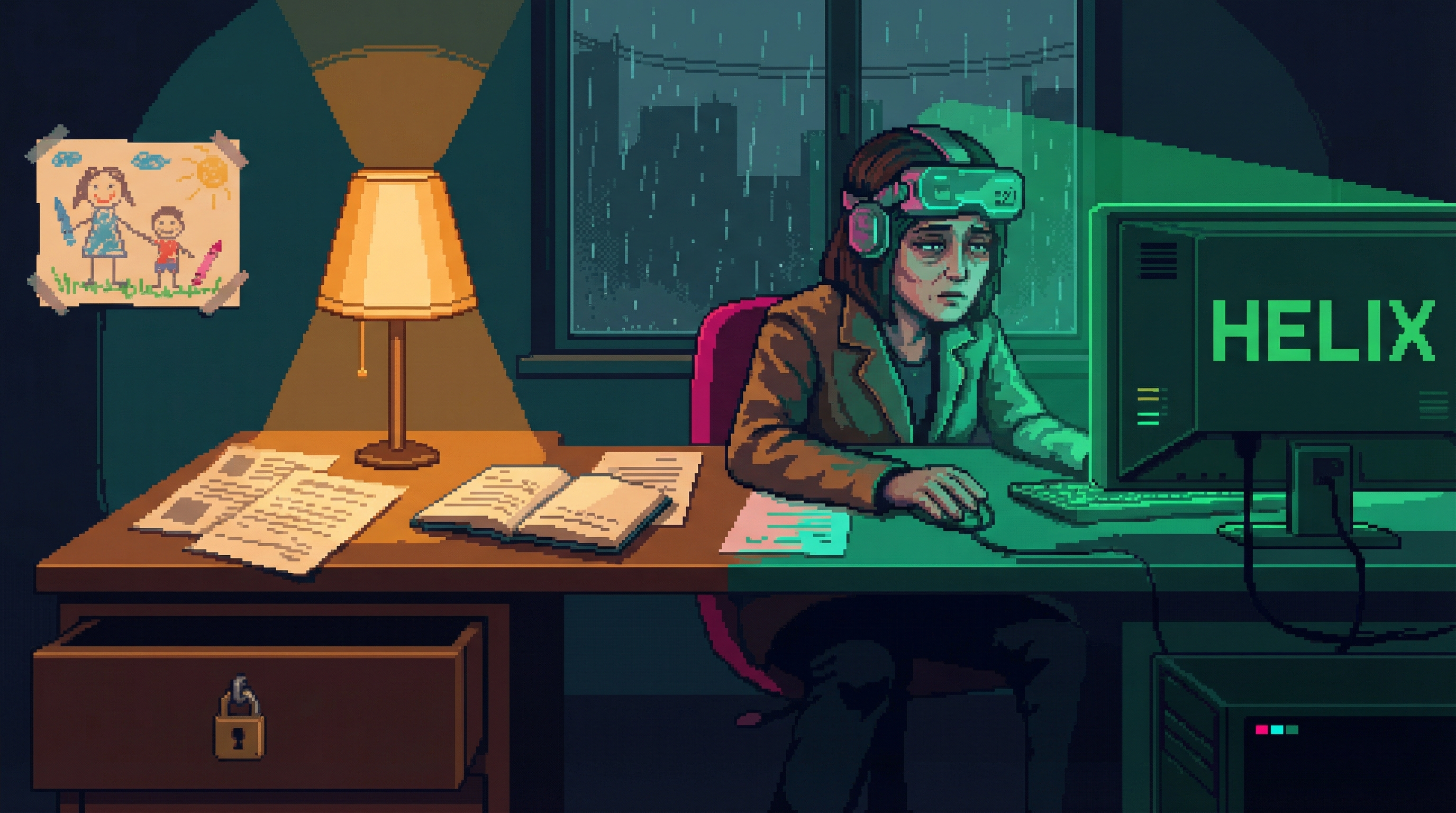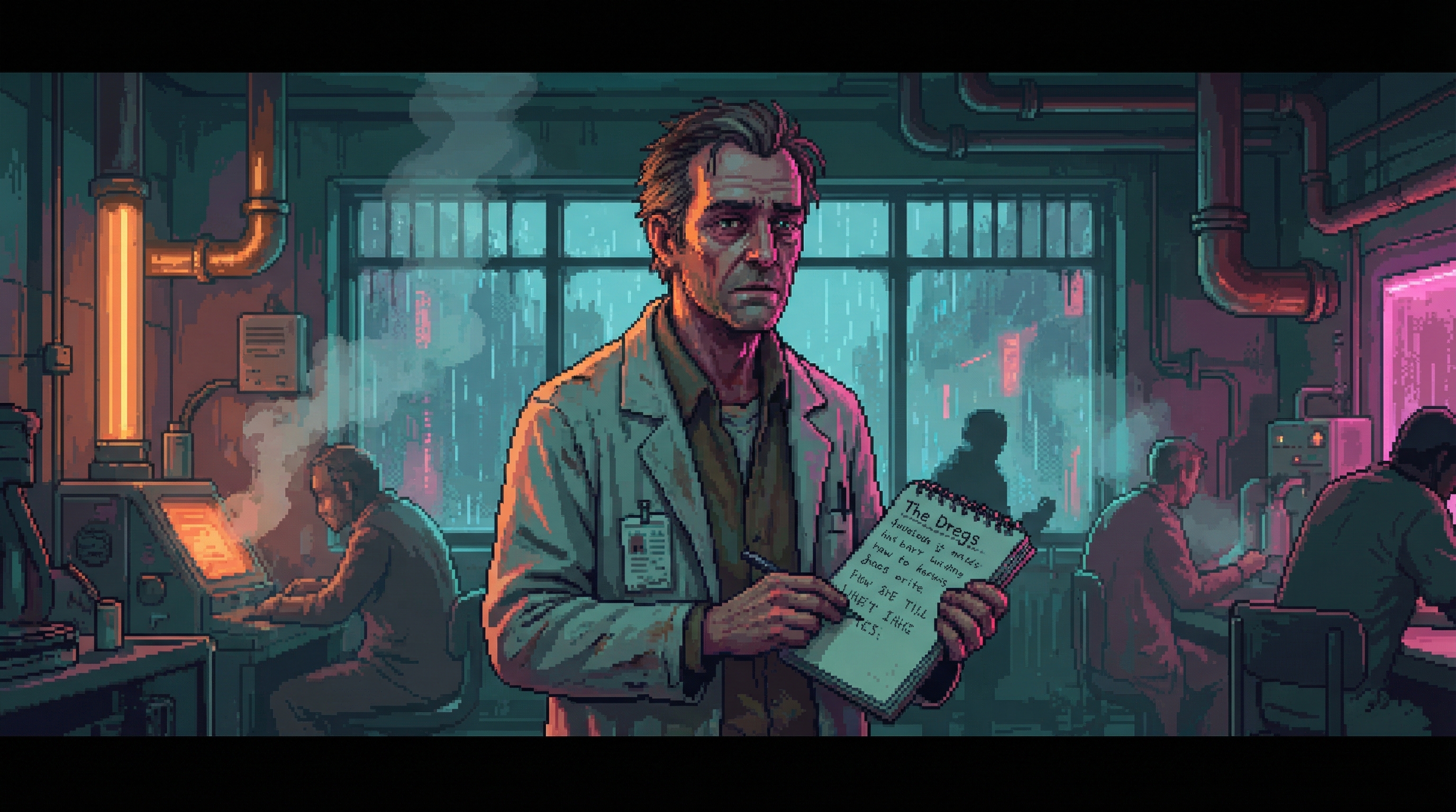 Forced-focus data analyst in Focus Mill Sector 4-5 β seven years of cognitive imprisonment to pay for his daughter Mia's neural interface calibration. His mind narrows so hers can remain broad.