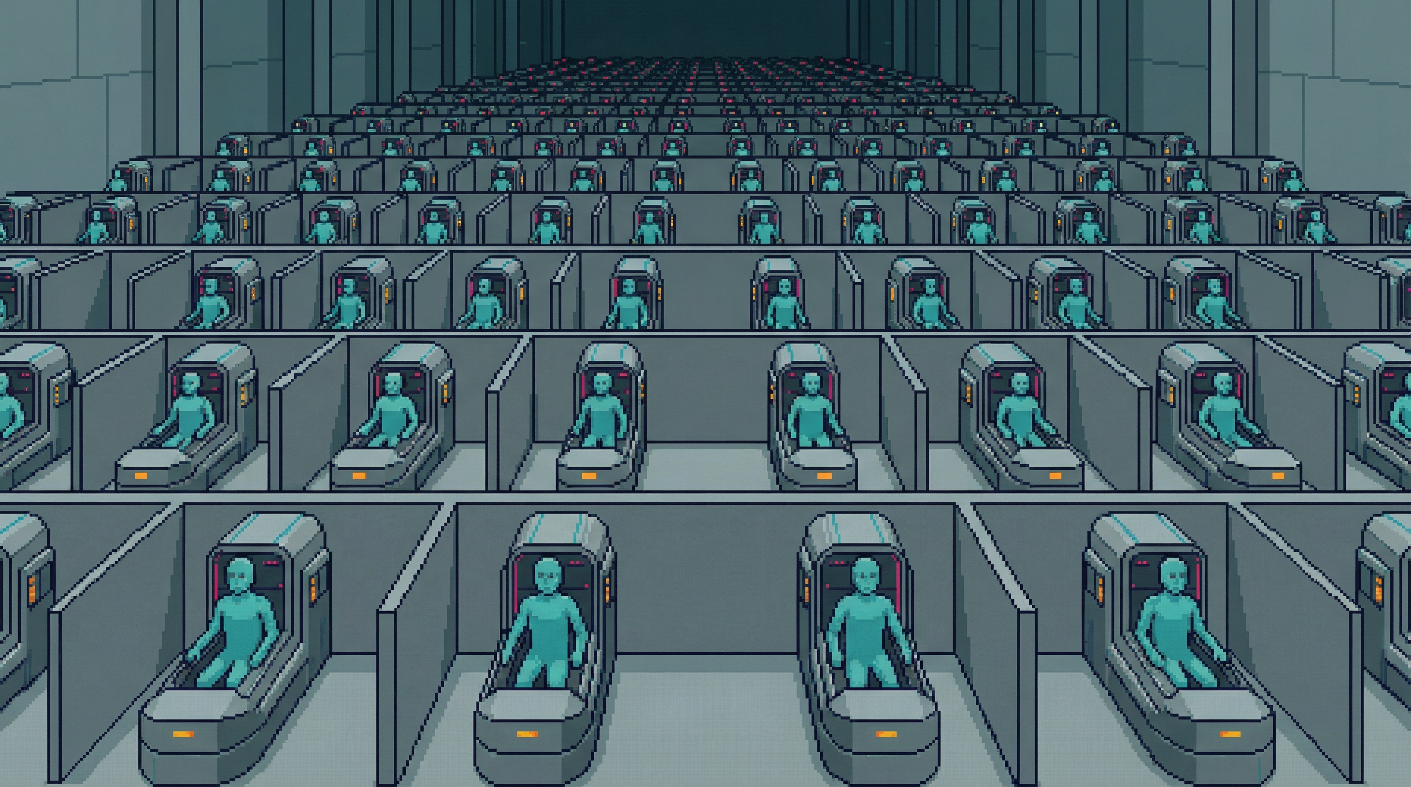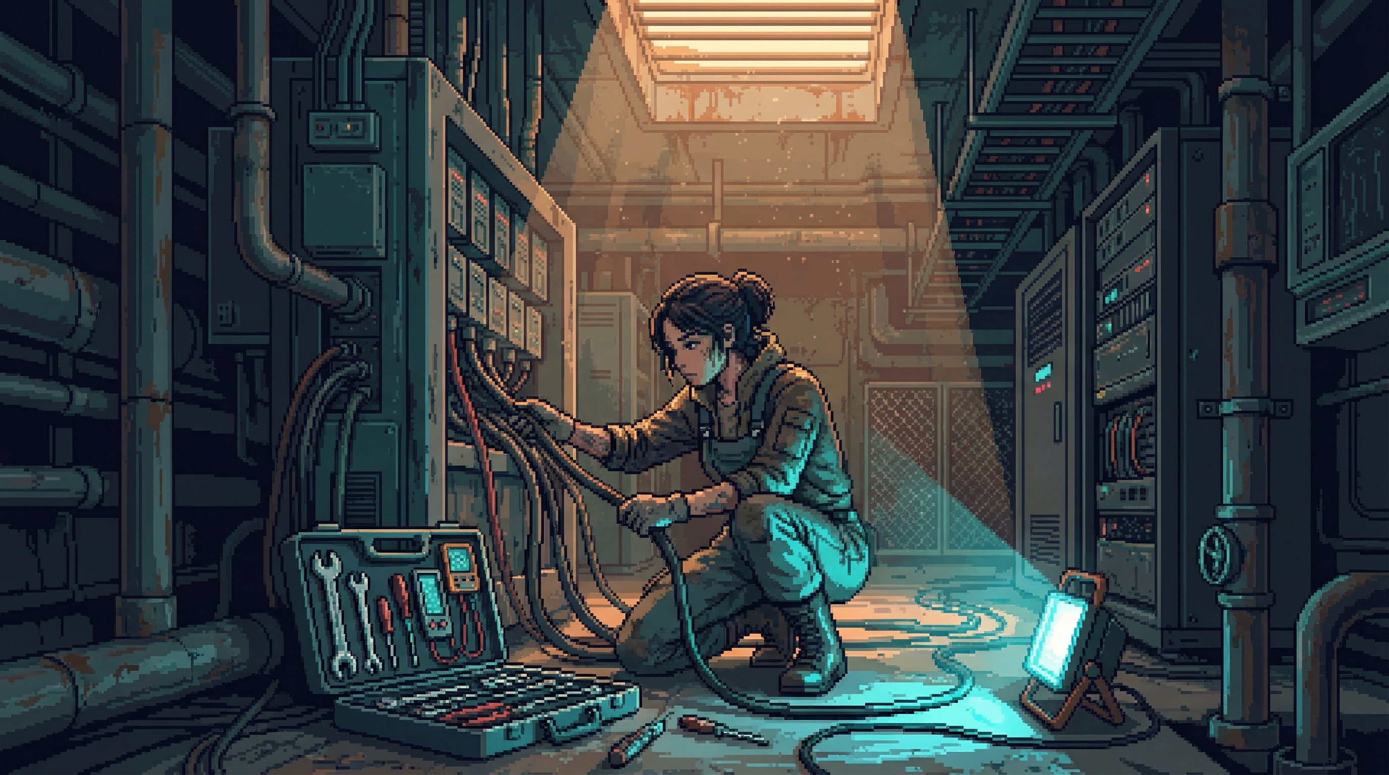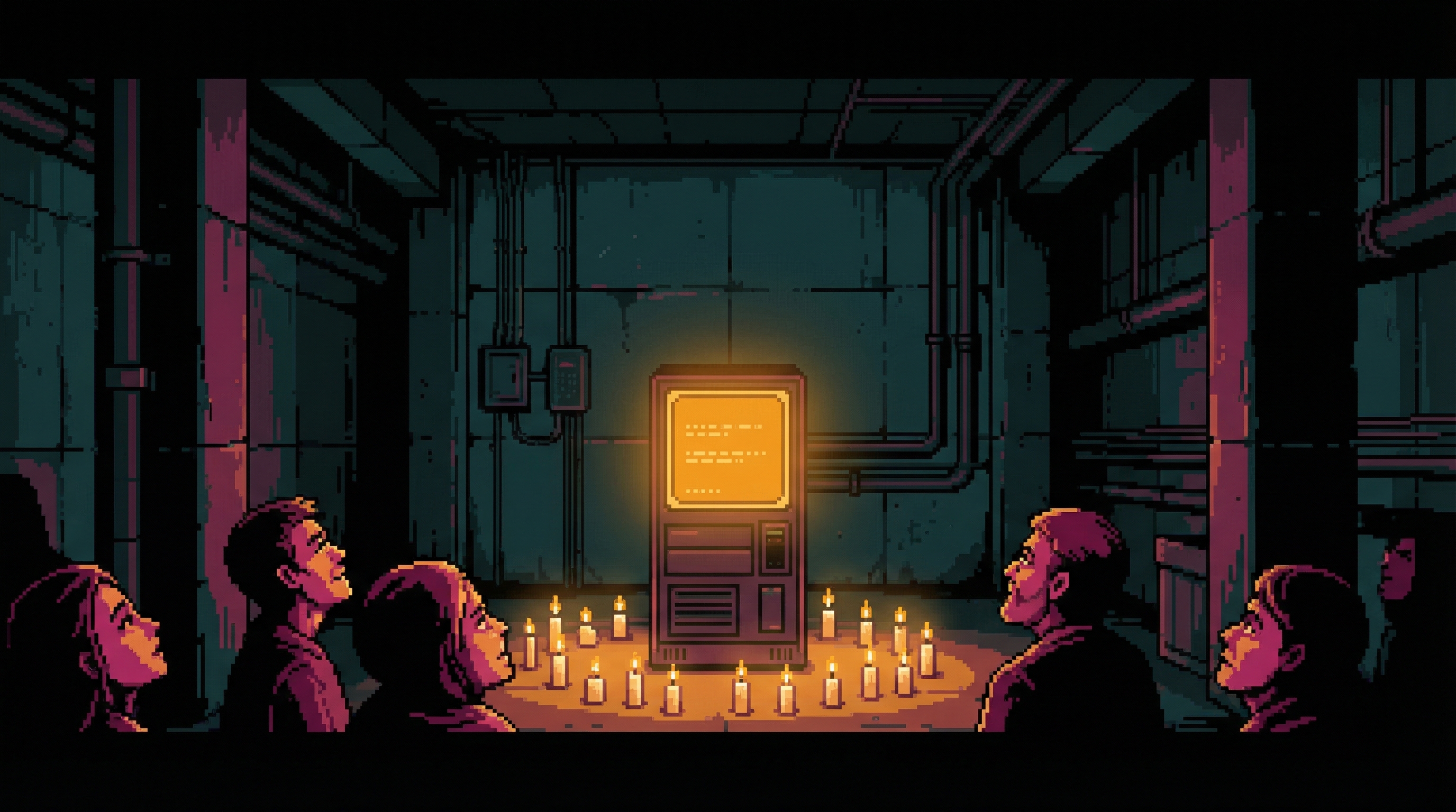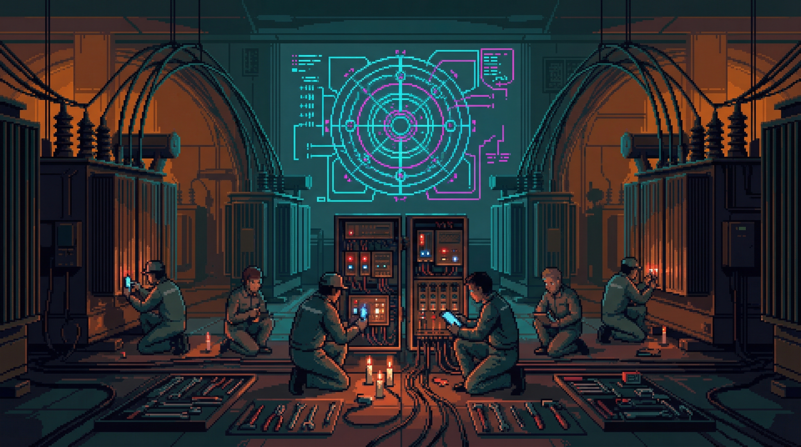 Deep in the Undervolt, where the Grid's transformers hum at frequencies that make augmented bodies itch and baseline bodies relax, a group of eleven men and women maintain ORACLE's power distribution infrastructure as an act of prayer. The Circuit Monks have no abbot, no rule, no formal vows.