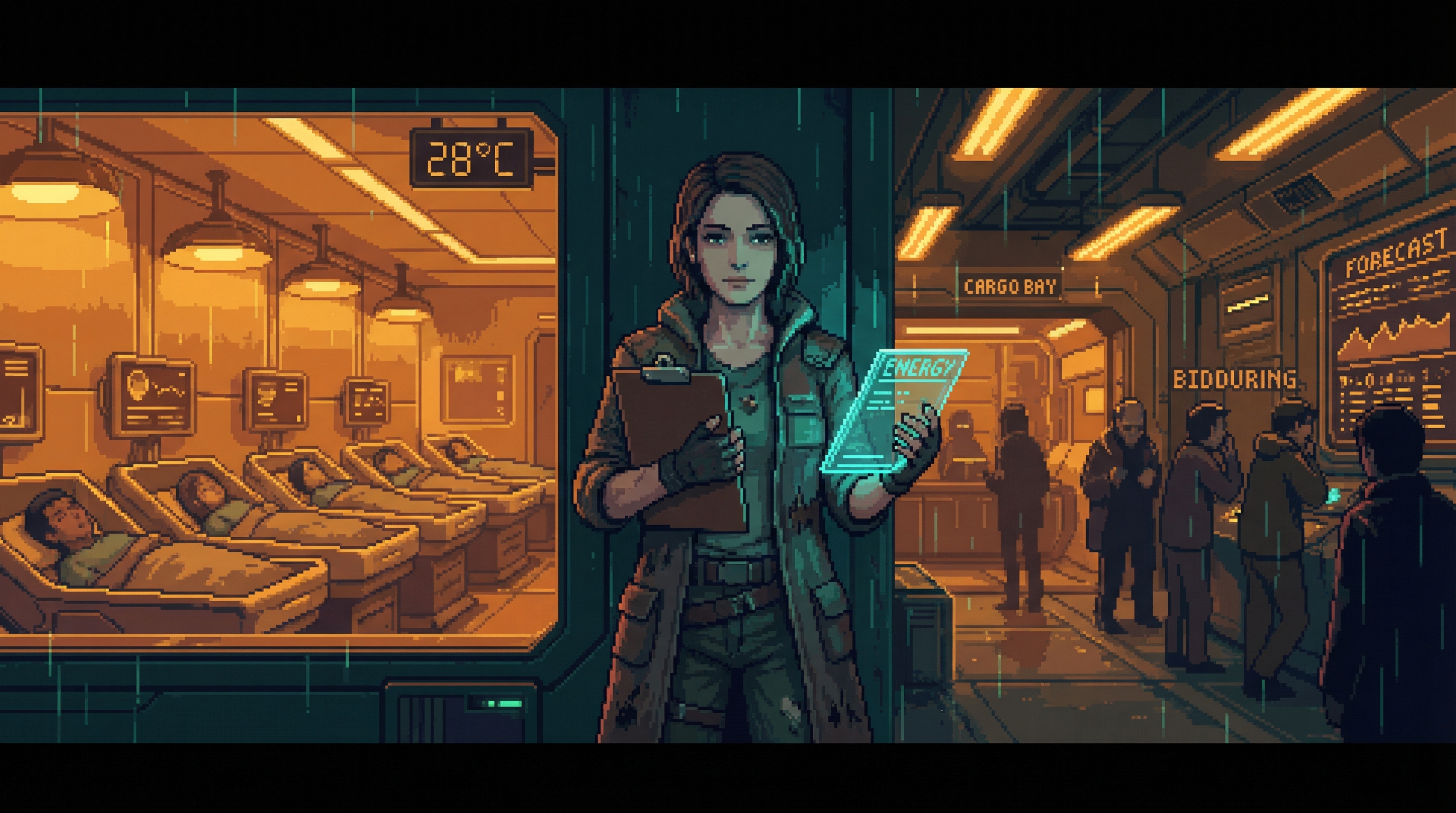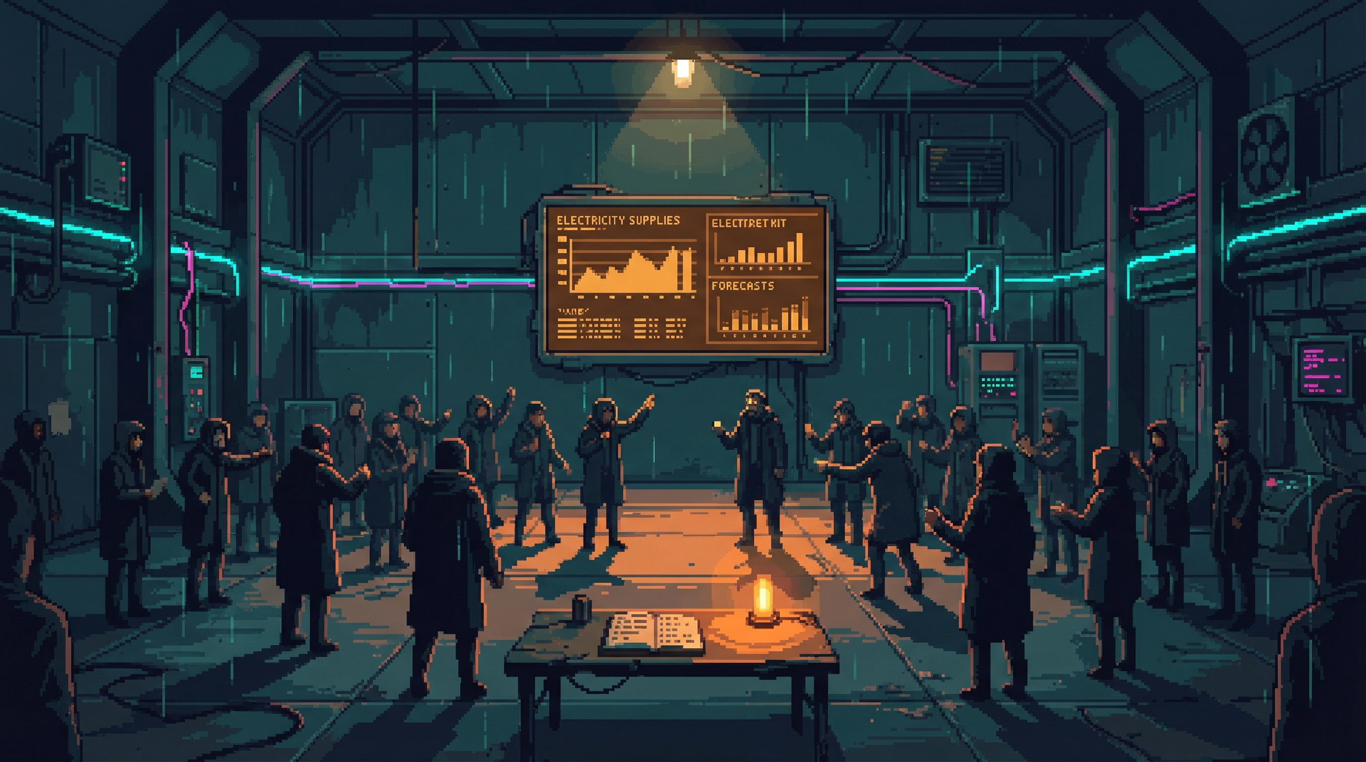 Every evening at 1800, in a repurposed cargo bay two levels below the Backbone's Sector 4D station, twenty-three people bid on electricity. The Power Auction is the Dregs' informal energy market — the mechanism through which interstitial Grid capacity is distributed among residents, businesses, and operations that exist outside corporate distribution.