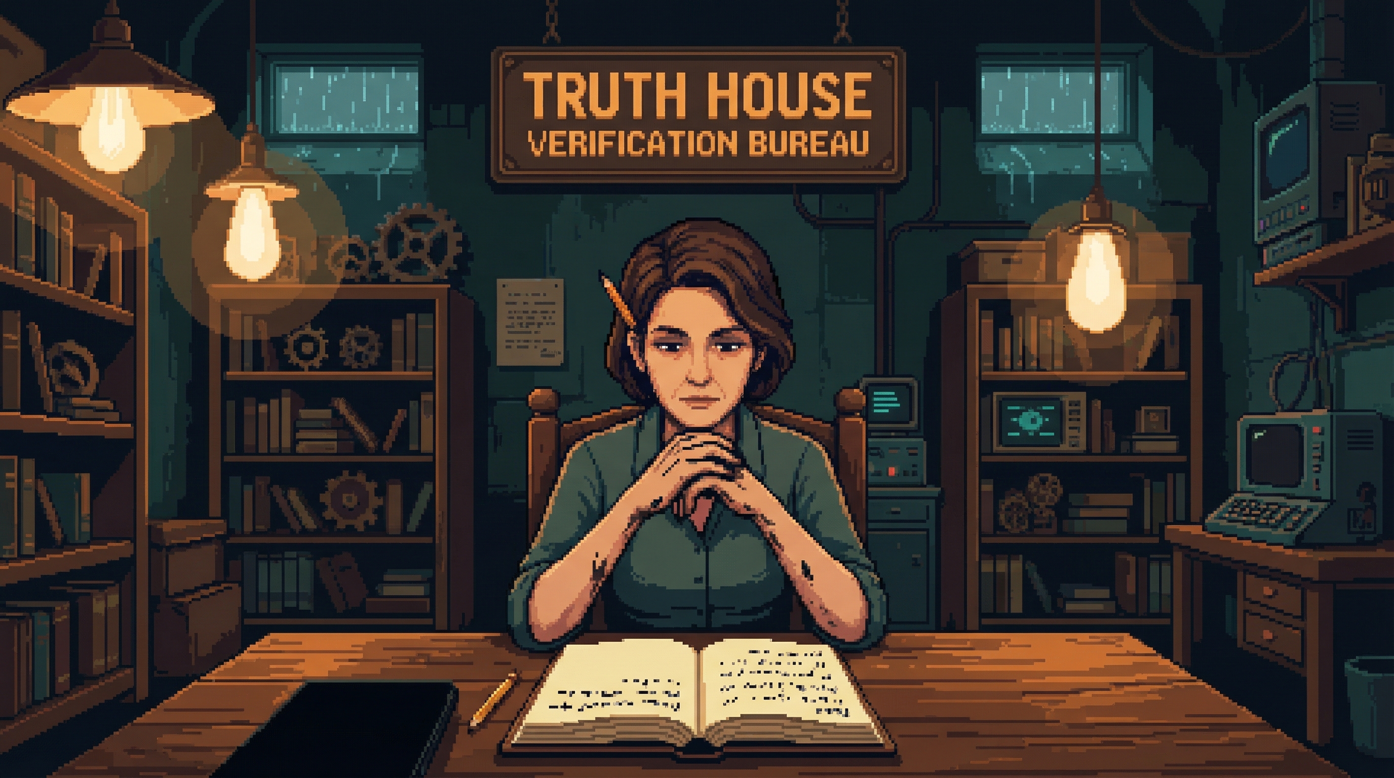 Three levels below the Backbone transit station in Sector 7G, behind a door marked "Environmental Testing — Authorized Personnel Only," there is a room where information is verified by hand. The Truth House is not a newsroom.