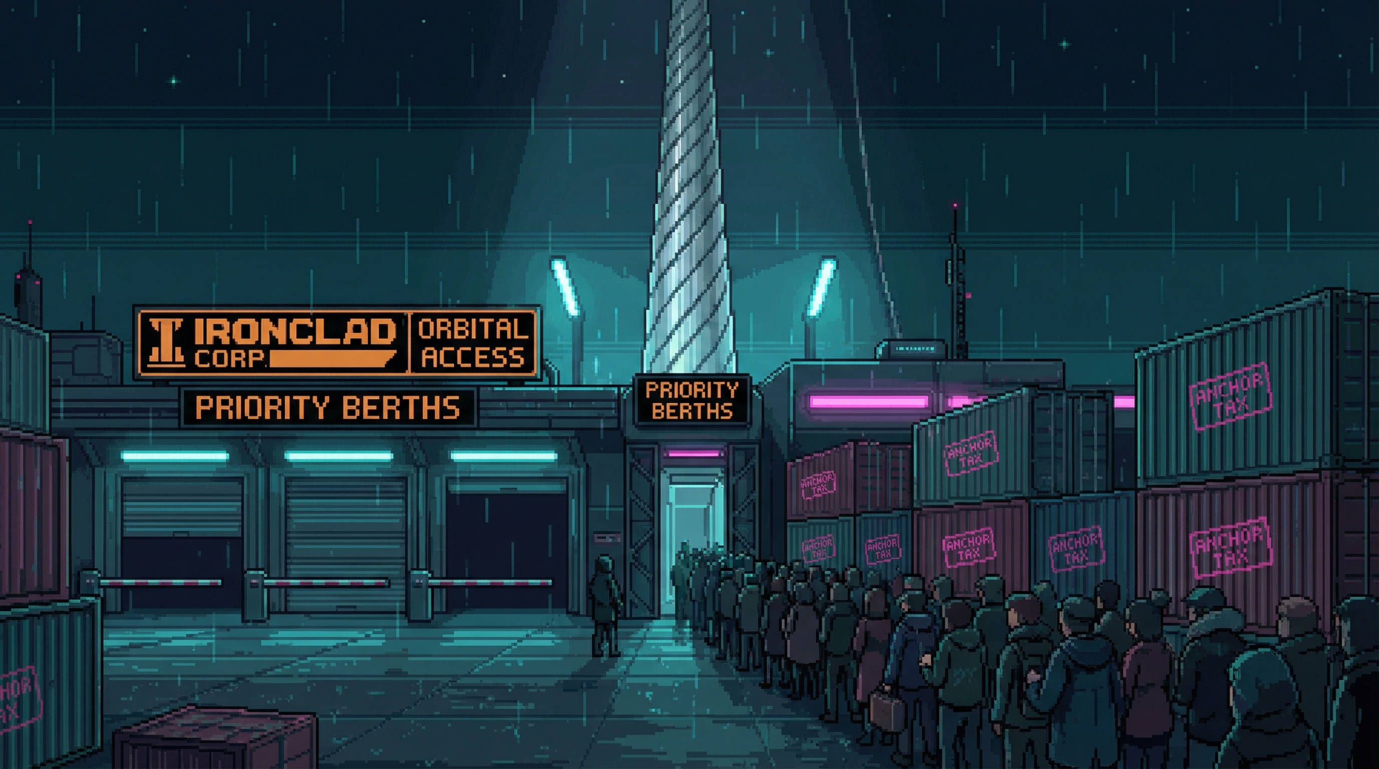 The Orbital Elevator operates under a regulatory framework that Ironclad Industries drafted in 2170, the year the Elevator was completed. The Elevator Compact is not a treaty — treaties require sovereign signatories, and the post-Cascade Sprawl has no sovereign entities in the traditional sense.