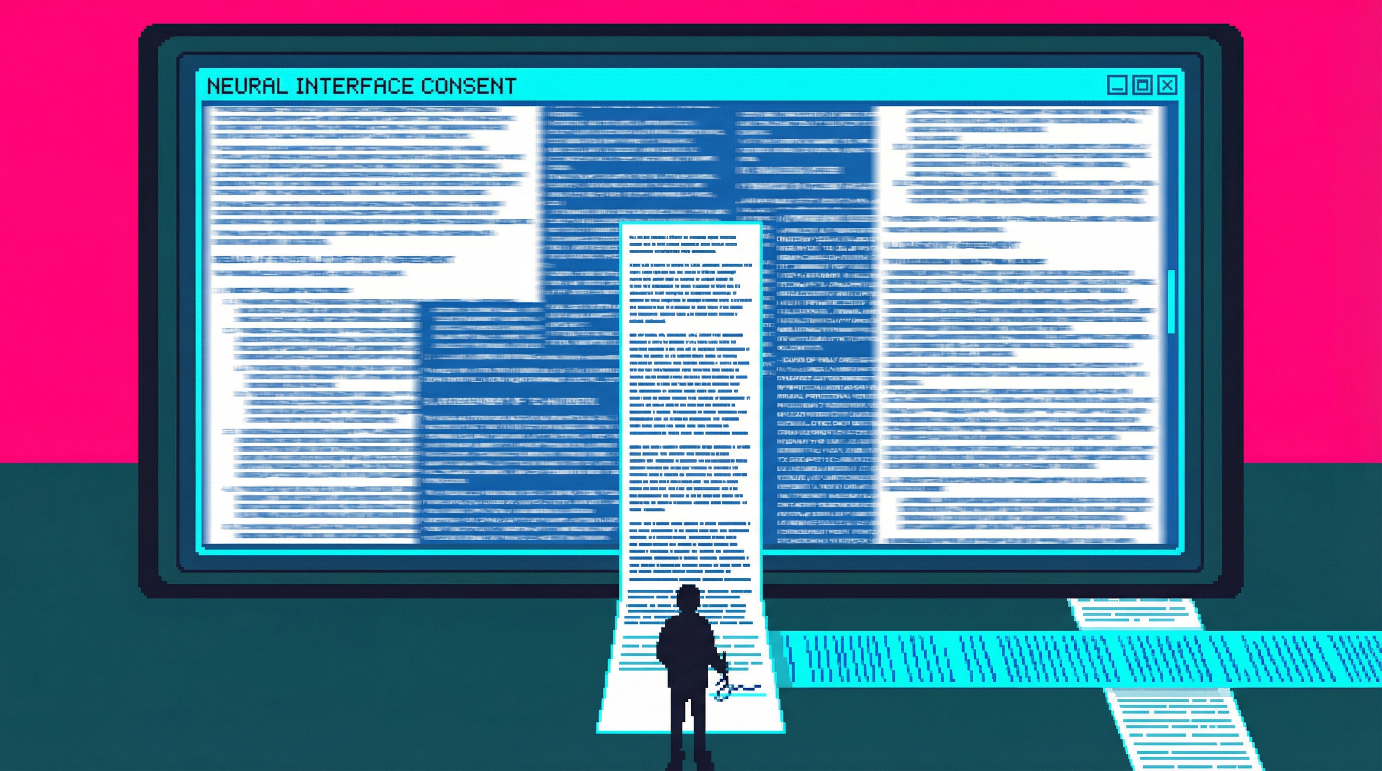 The most profitable legal fiction in the Sprawl is the word "consent." The Consent Architecture operates through three layers that together make meaningless agreement legally binding. The **Presentation Layer** creates a bootstrapping paradox β the agreement is displayed through the neural interface whose activation requires the agreement's acceptance.